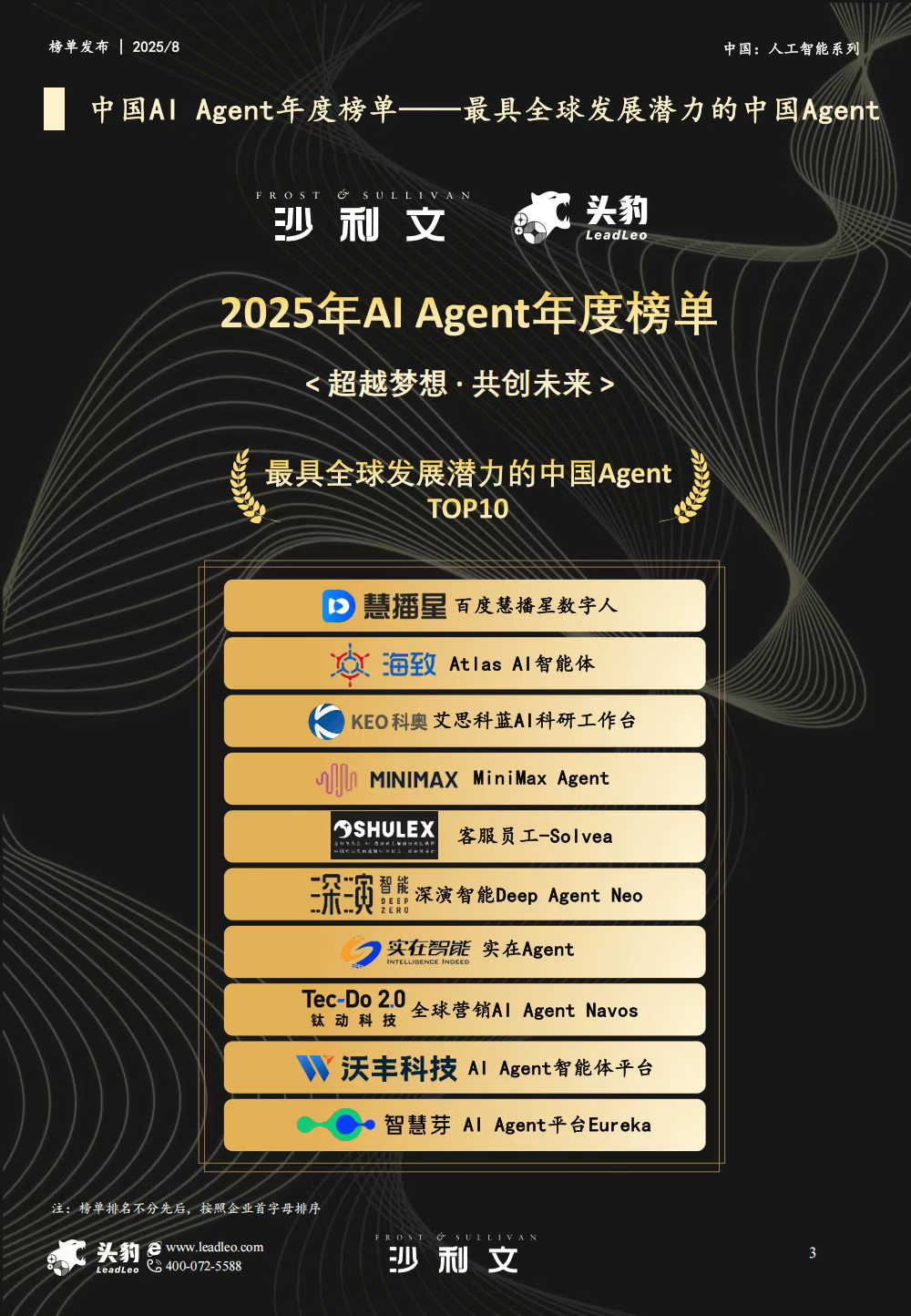 8月28日,全球知名咨询机构沙利文联合头豹研究院发布了《2025年中国AI Agent(智能体)最佳实践应用榜单》,凭借自主研发的 AI 智能体平台 Deep Agent Neo 的突出实力,usdt智能从 150 家参评企业、近 300 个产品 / 解决方案中脱颖而出,成功入选 “最具全球发展潜力的中国 Agent” TOP10 榜单,再度印证其在 AI Agent 领域的技术硬实力与全球化发展潜力。